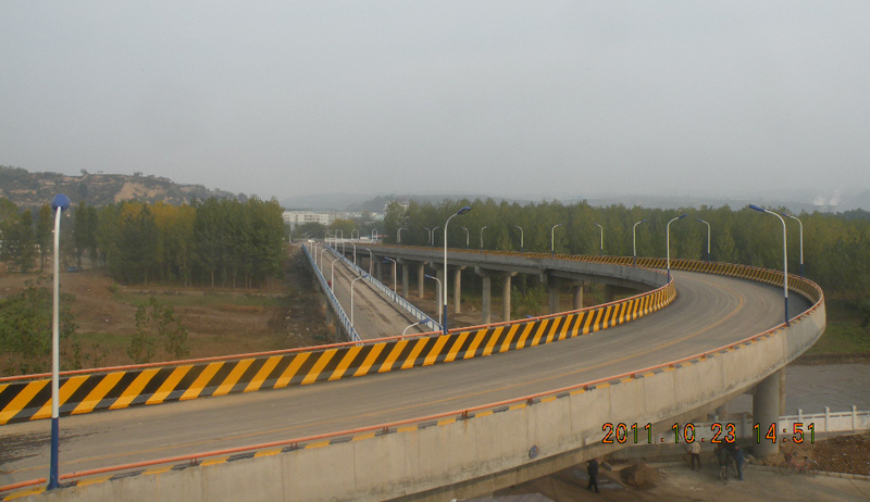 國電霍州發(fā)電廠跨汾河公路大橋東接國道108線(霍侯一級公路),西連電廠運煤公路,東接口處南有霍州礦務(wù)局木材加工廠,北有個體汽車修理廠,居民較少。向西跨越汾河進(jìn)入電廠廠區(qū)后要上跨電廠主要出入道路。橋梁分左、右幅:左幅主要承擔(dān)電廠職工的生產(chǎn)、生活用車通行;右幅主要承擔(dān)電廠運煤、運渣等車輛通行。終點要與國道108線(霍侯一級公路)相連接,接點位置位于國道108線K826+160處。