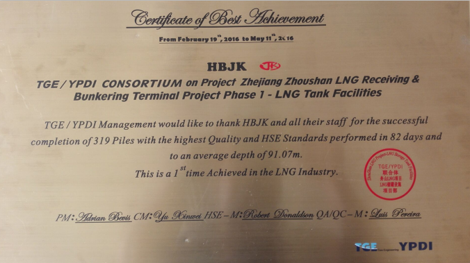 近日我公司收到TGE/YPDI的浙江舟山LNG儲罐接收站項目“最佳成績證書”牌匾,內(nèi)容:TGE/YPDI 管理層對2016年2月19日至2016年5月11日期間河北建勘及其員工以高質(zhì)量和嚴格的HSE管理標(biāo)準(zhǔn)在82天內(nèi)完成319根樁基且平均深度在91.07米的成績表示感謝。