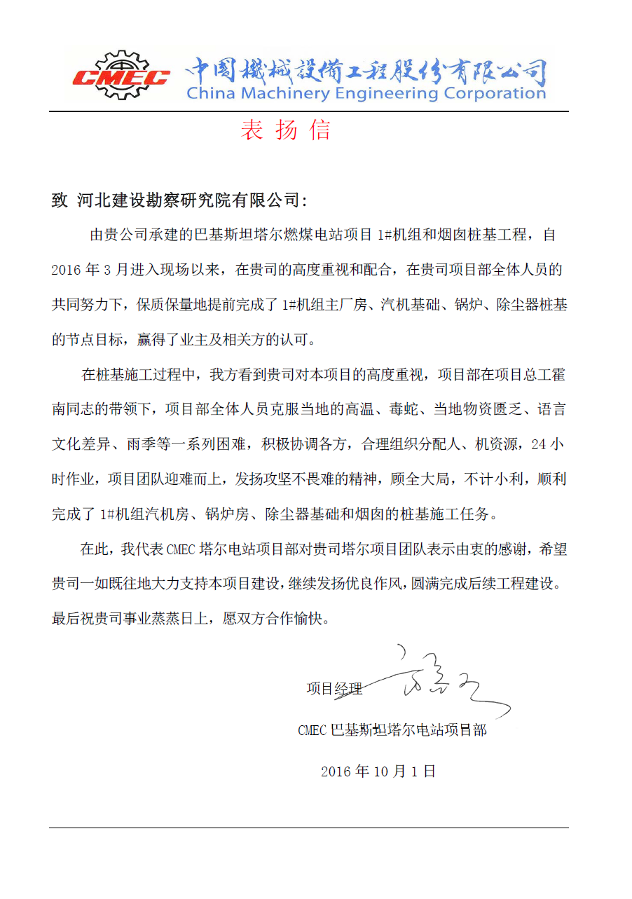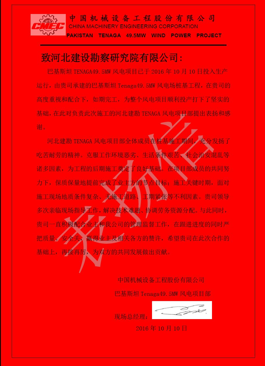 由我公司承建的巴基斯坦塔爾燃煤電站項(xiàng)目1#機(jī)組和煙囪樁基工程和巴基斯坦Tenaga49.5MW風(fēng)電項(xiàng)目,項(xiàng)目部全體人員在項(xiàng)目總工霍南的帶領(lǐng)下,克服工作環(huán)境惡劣、生活條件艱苦等一系列困難,積極協(xié)調(diào)各方,合理組織分配資源,順利完成階段施工任務(wù)。近日,總包方中國(guó)機(jī)械設(shè)備工程股份有限公司(CMEC)向我公司發(fā)來感謝信,對(duì)我公司兩個(gè)項(xiàng)目部團(tuán)隊(duì)表示由衷的感謝,并希望我們繼續(xù)發(fā)揚(yáng)優(yōu)良作風(fēng),圓滿完成后續(xù)工程建設(shè)。