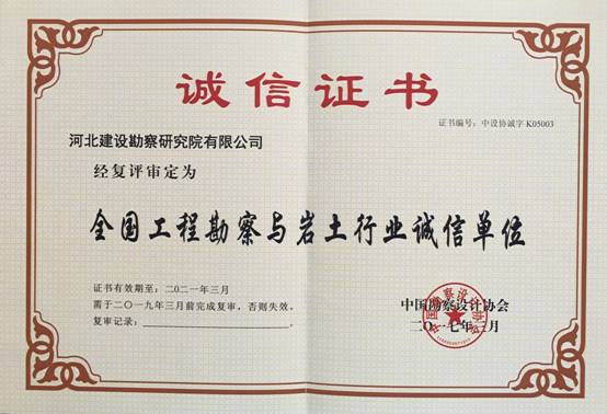 根據(jù)中國勘察設(shè)計(jì)協(xié)會5月15日發(fā)布的中設(shè)協(xié)字[2017]29號文件《關(guān)于公布工程勘察與巖土行業(yè)第一批第二批“誠信單位”復(fù)評、復(fù)審結(jié)果的通知》,我公司作為第一批271家“誠信單位”之一,通過復(fù)評審核,被審定為全國工程勘察與巖土行業(yè)誠信單位,并于近日領(lǐng)取了誠信證書。