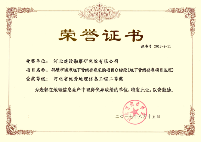 近日,經(jīng)河北省測繪學(xué)會評選,由我公司承擔(dān)的鶴壁市城市地下管線普查采購項目C標(biāo)段(地下管線普查項目監(jiān)理)榮獲河北省優(yōu)秀地理信息工程二等獎。
