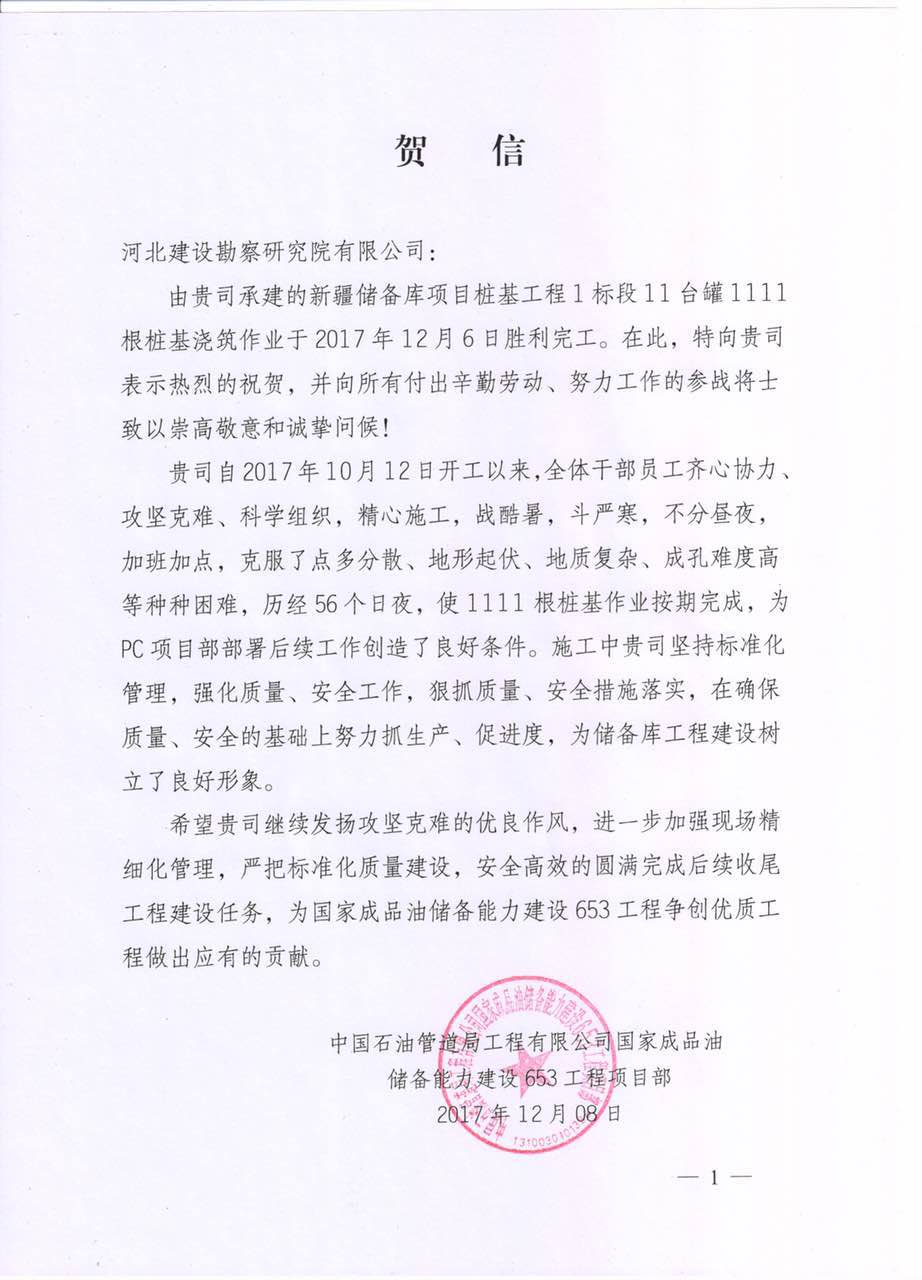 我公司承建的新疆儲備庫項目樁基工程1標段11臺罐1111根樁基澆筑作業(yè)于2017年12月6日勝利完工。中國石油管道局工程有限公司國家成品油儲備能力建設(shè)653工程項目部發(fā)來賀信,對我項目部重安全,重質(zhì)量的工作作風(fēng)表示充分地肯定,也對我項目部為儲備庫工程建設(shè)樹立良好形象提出了表揚。
