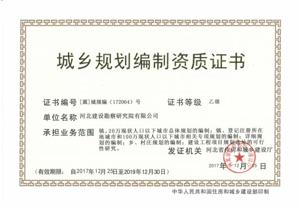 經(jīng)過艱苦努力,我公司于2017年12月25日取得了城鄉(xiāng)規(guī)劃編制乙級資質(zhì)證書,可承擔(dān)20萬現(xiàn)狀人口以下城市總體規(guī)劃的編制,登記注冊所在地城市和100萬現(xiàn)狀人口以下城市相關(guān)專項規(guī)劃的編制,以及建設(shè)工程項目規(guī)劃選址的可行性研究。