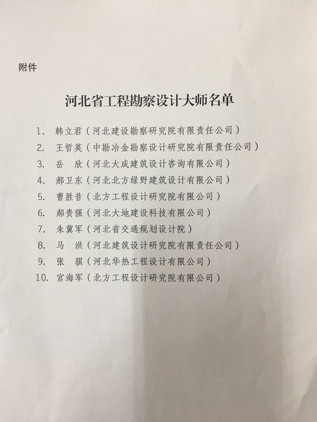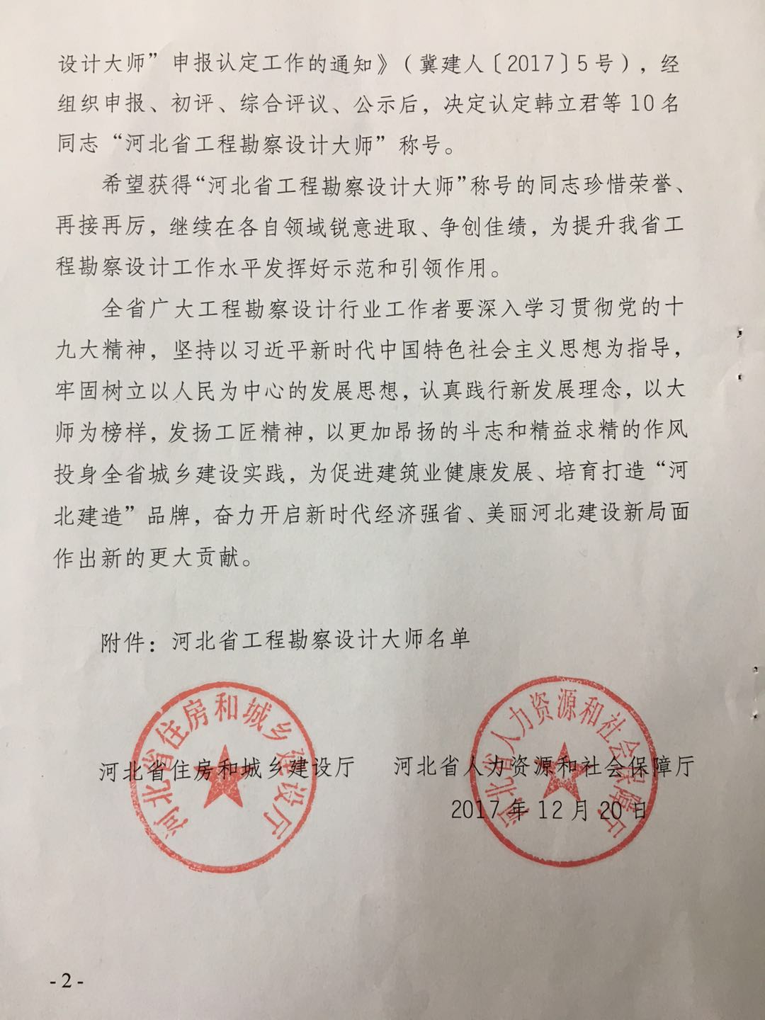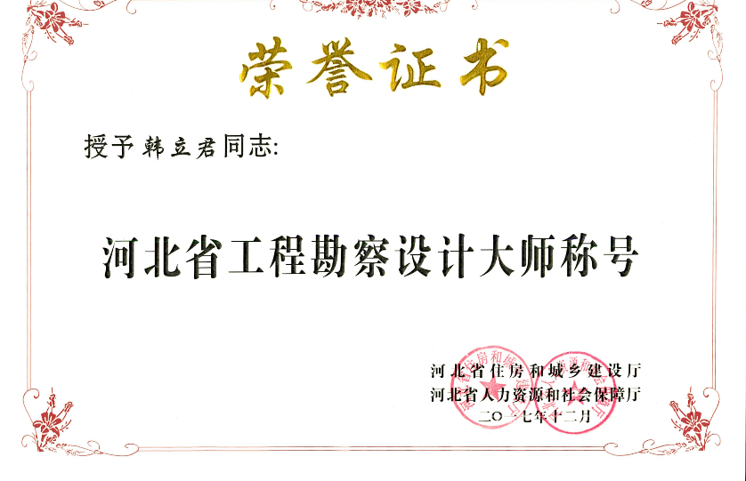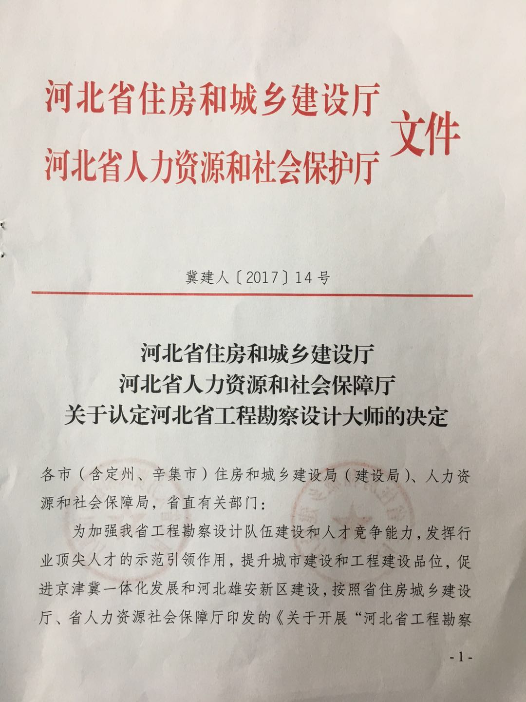 近日,從河北省住房和城鄉(xiāng)建設(shè)廳、河北省人力資源和社會保護(hù)廳聯(lián)合印發(fā)的《關(guān)于認(rèn)定河北省工程勘察設(shè)計(jì)大師的決定》獲悉,公司董事長韓立君榮獲“河北省工程勘察設(shè)計(jì)大師”稱號。