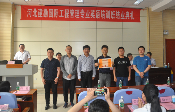 公司委托石家莊鐵道大學(xué)繼續(xù)教育學(xué)院舉辦的首屆國際工程管理專業(yè)英語培訓(xùn)班(共29人,分6組),經(jīng)過28天的緊張培訓(xùn),已經(jīng)完成全部課程的學(xué)習(xí)。2018年5月14日下午,石家莊鐵道大學(xué)第九實(shí)驗(yàn)室103教室,書聲瑯瑯,掌聲雷鳴,公司首屆國際工程管理專業(yè)英語培訓(xùn)班結(jié)業(yè)典禮在這里舉行,出席結(jié)業(yè)典禮的有:公司總經(jīng)理李華偉、總工程師聶慶科、人力資源部主任張軍旗及全體學(xué)員;石家莊鐵道大學(xué)副校長陳進(jìn)杰、繼續(xù)教育學(xué)院院長王書海、繼續(xù)教育學(xué)院副院長楊杰、外語系黨支部書記林治華、外語系副主任李玉潔、培訓(xùn)班班主任孫艷以及教師和助教。