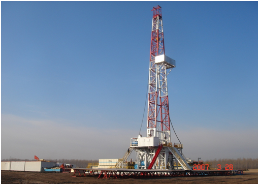 該型頁(yè)巖氣鉆機(jī),包括底座、井架、動(dòng)力裝置、傳動(dòng)機(jī)構(gòu)、聯(lián)動(dòng)機(jī)構(gòu)、轉(zhuǎn)盤(pán)、絞車(chē)、游車(chē)、高壓管路、泥漿泵以及氣控系統(tǒng)。其優(yōu)點(diǎn)在于:通過(guò)采用密閉水冷式絞車(chē),滾筒摩擦轂冷卻采用離心泵強(qiáng)制循環(huán)水冷卻方式,主滾筒摩擦轂上帶有水套和水循環(huán)管線(xiàn);動(dòng)力裝置采用三臺(tái)柴油發(fā)動(dòng)機(jī),同時(shí)三臺(tái)柴油發(fā)動(dòng)機(jī)之間設(shè)置聯(lián)動(dòng)機(jī)構(gòu),增大功率;配備兩臺(tái)3NB 1300C泥漿泵,能滿(mǎn)足噴射鉆井的需要。