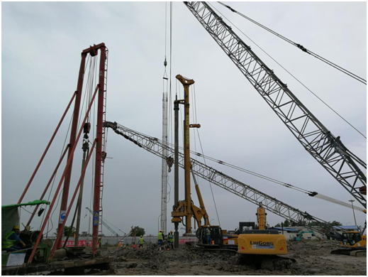 該項(xiàng)目于2018年3月10日開工,2018年9月2日竣工,共計(jì)完成直徑600mm鉆孔灌注樁1250根,樁長為30.15m,混凝土方量10650m³,高峰期時投入旋挖鉆機(jī)3臺套,回轉(zhuǎn)鉆機(jī)5臺套。