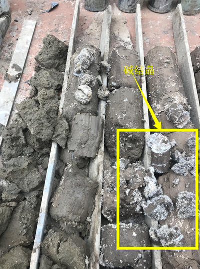 從“堵、疏、糾、換”四個方面對建筑物進行治理。即高壓旋噴樁對堿液進行封堵,排水管對堿液進行疏導,用基底取土法對建筑物進行糾偏,3:7灰土對路面進行換填處理。