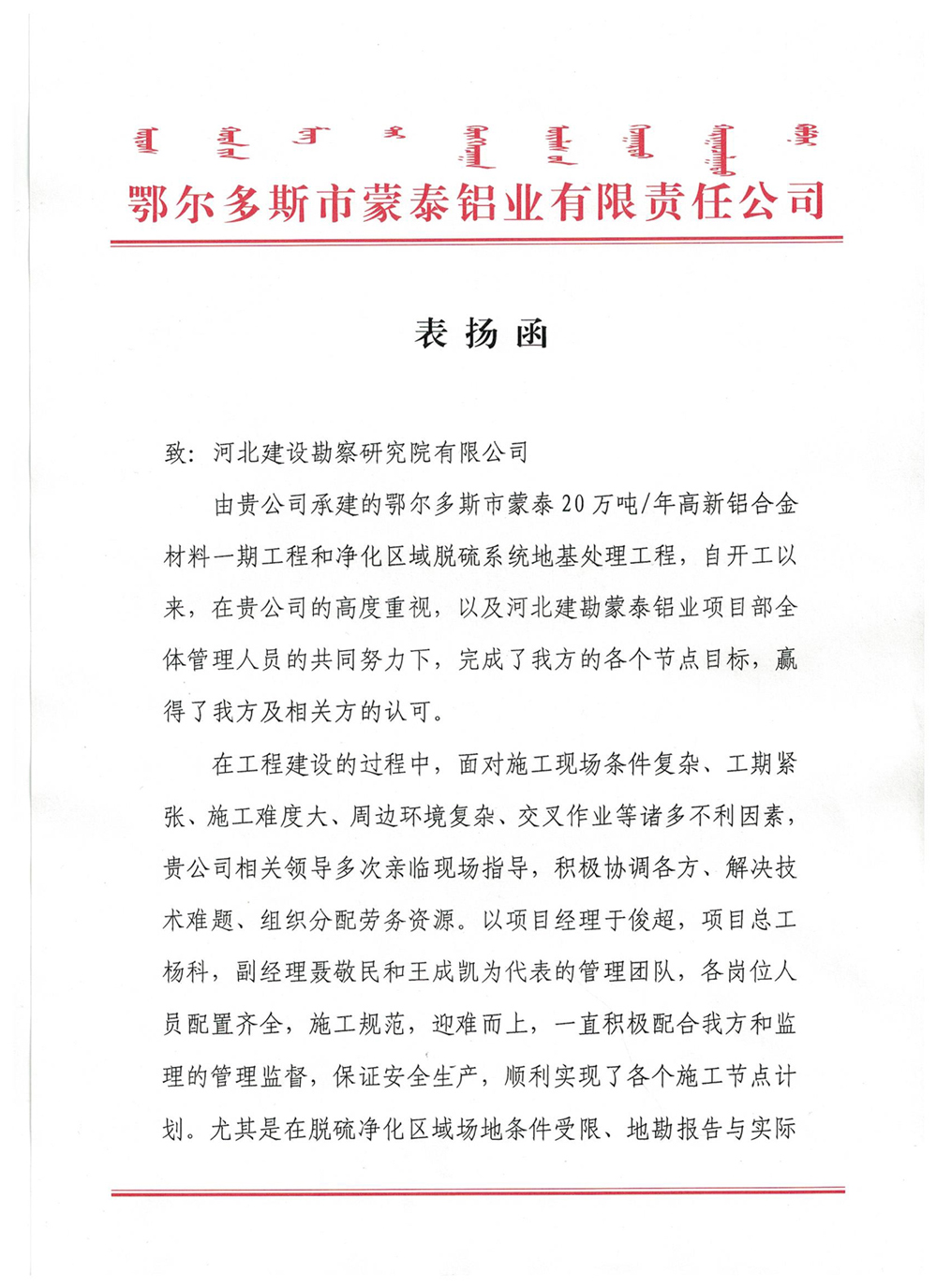 近日,鄂爾多斯市蒙泰鋁業(yè)有限責(zé)任公司發(fā)來的表?yè)P(yáng)函,對(duì)我項(xiàng)目部負(fù)責(zé)施工的鄂爾多斯蒙泰20萬(wàn)噸/年高新鋁合金材料一期工程和凈化區(qū)域脫硫系統(tǒng)地基處理工程在施工過程中的優(yōu)異表現(xiàn)予以表?yè)P(yáng)。