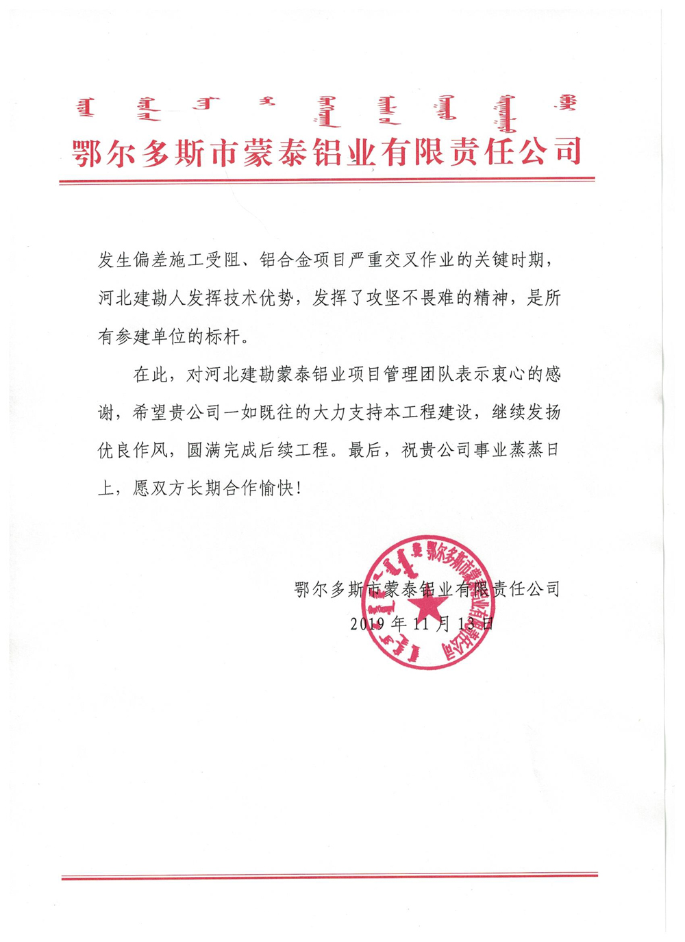 公司收到鄂爾多斯市蒙泰鋁業(yè)有限責(zé)任公司發(fā)來的表?yè)P(yáng)函