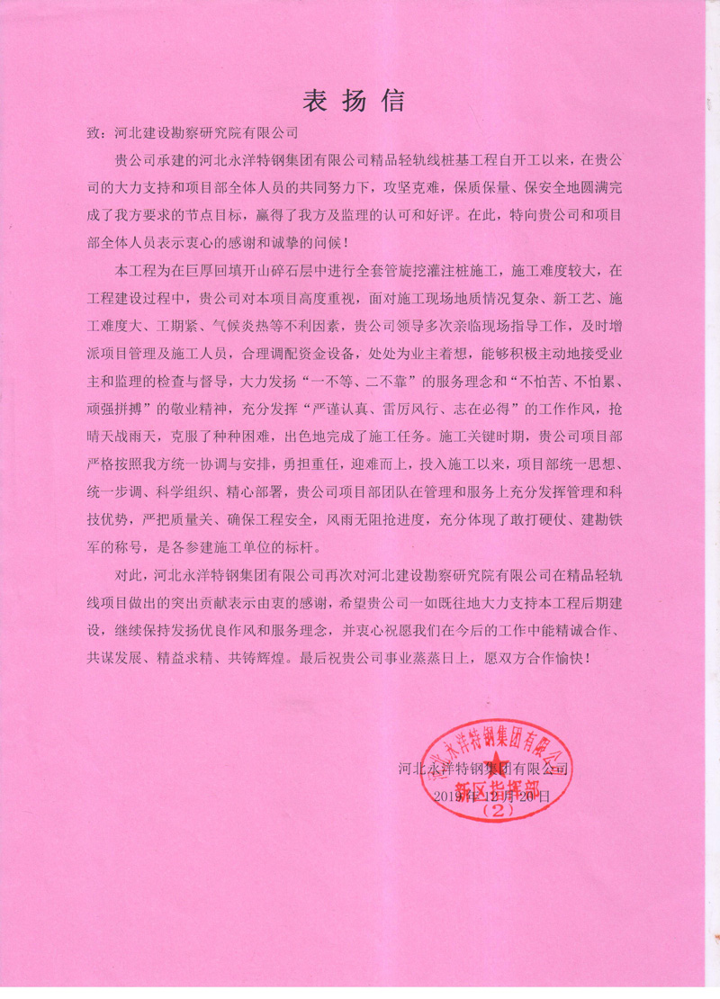 近日,我公司河北永洋特鋼集團有限公司精品輕軌線樁基工程收到河北永洋特鋼集團有限公司的表揚信。項目部全體員工大力發(fā)揚“一不等、二不靠”的服務理念和“不怕苦、不怕累、頑強拼搏”的敬業(yè)精神,充分發(fā)揮“嚴謹認真、雷厲風行、志在必得”的工作作風,搶晴天戰(zhàn)雨天,克服了種種困難,出色地完成了施工任務。甲方對項目部全體員工的辛勤付出,給予了高度認可和評價,并為后續(xù)雙方的合作奠定了良好基礎。并衷心祝愿我們在今后的工作中能精誠合作、共謀發(fā)展、精益求精、共鑄輝煌。