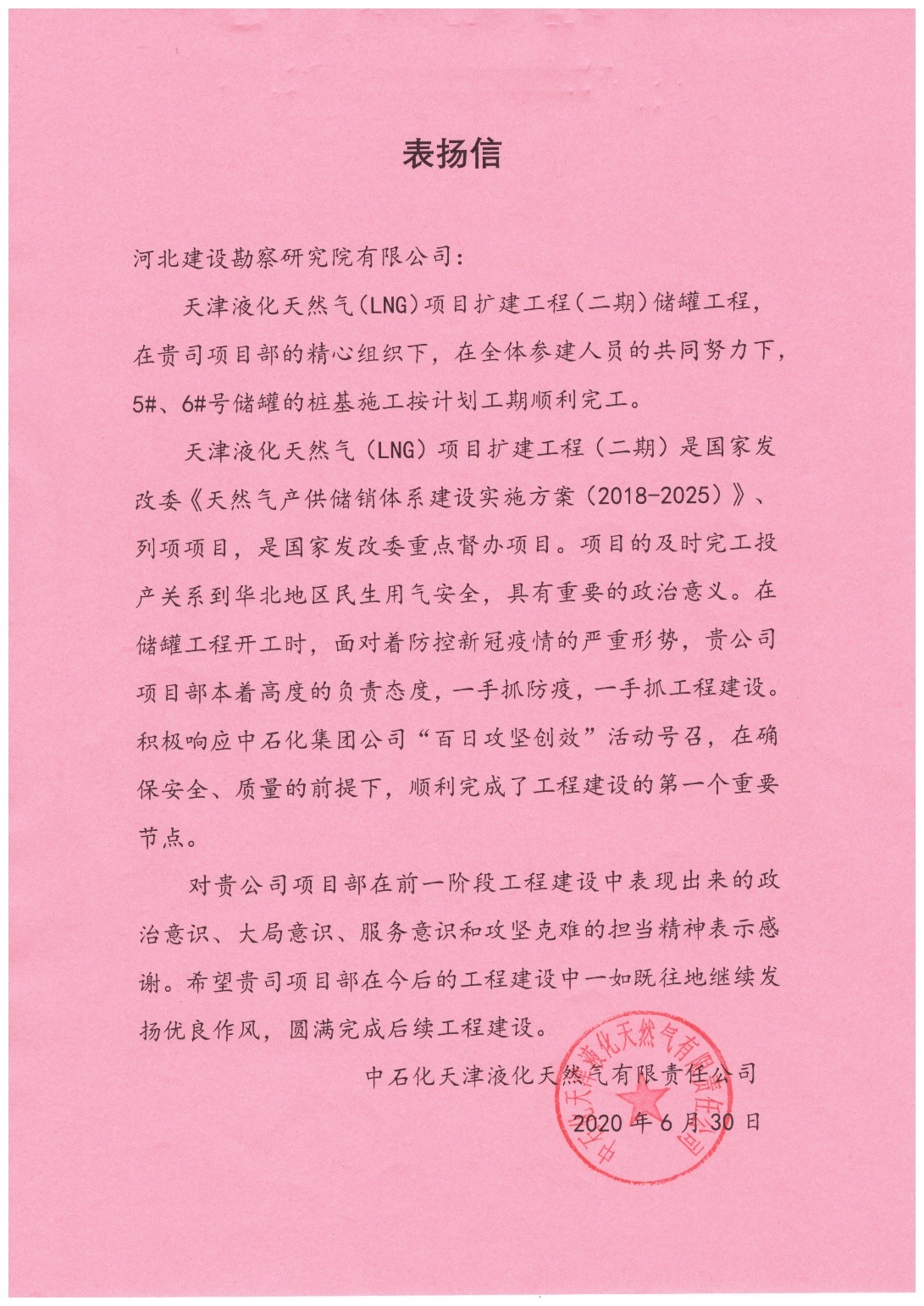 公司承建的天津液化天然氣(LNG)項(xiàng)目擴(kuò)建工程(二期)5#6#罐樁基工程,自2020年4月5日正式開工,歷經(jīng)83個(gè)日夜的奮戰(zhàn),最終于2020年6月26日優(yōu)質(zhì)、高效、圓滿的完成了5#6#罐的樁基施工任務(wù)。中石化天津液化天然氣有限責(zé)任公司,對我公司中石化天津LNG二期項(xiàng)目部提出表揚(yáng),表揚(yáng)我公司領(lǐng)導(dǎo)及全體項(xiàng)目施工人員對項(xiàng)目高度負(fù)責(zé)的態(tài)度,一手抓防疫,一手抓工程建設(shè),積極響應(yīng)中石化集團(tuán)公司“百日攻堅(jiān)創(chuàng)效”活動(dòng)號(hào)召,在確保安全、質(zhì)量的前提下,順利完成了工程建設(shè)的第一個(gè)重要節(jié)點(diǎn)。同時(shí)對我公司在前一階段工程建設(shè)中表現(xiàn)出來的政治意識(shí)、大局意識(shí)、服務(wù)意識(shí)和攻堅(jiān)克難的擔(dān)當(dāng)精神表示感謝。希望我公司在今后的工程建設(shè)中一如既往地繼續(xù)發(fā)揚(yáng)優(yōu)良作風(fēng),圓滿完成后續(xù)工程建設(shè)。