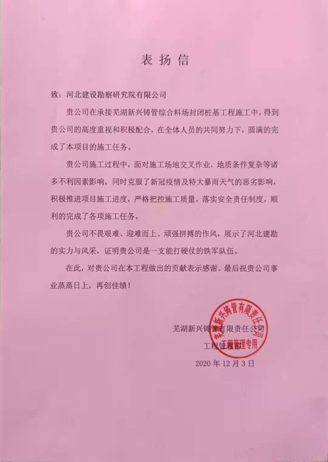 近日,公司收到蕪湖新興鑄管有限責(zé)任公司發(fā)來的表揚(yáng)信,對(duì)我公司在蕪湖新興鑄管綜合料場(chǎng)封閉樁基施工過程中,面對(duì)施工場(chǎng)地交叉作業(yè),地質(zhì)條件復(fù)雜等諸多不利因素,同時(shí)克服了新冠疫情及特大暴雨天氣的惡劣影響,順利完成了各項(xiàng)施工任務(wù),給予了充分的肯定,并表示感謝!
