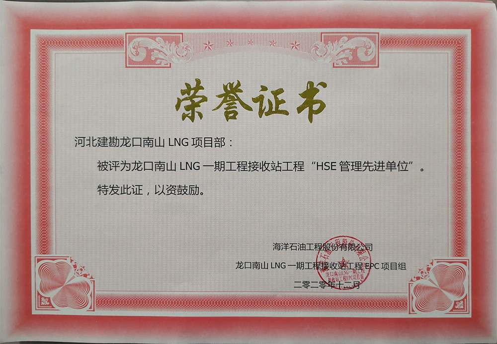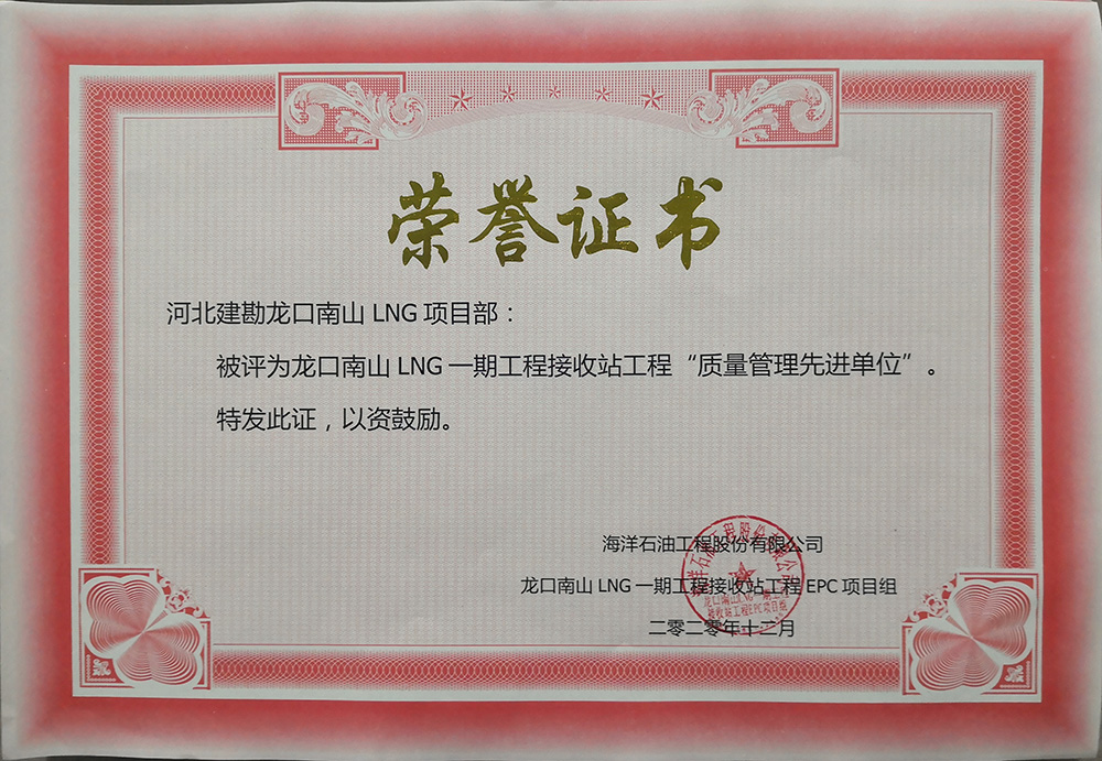 2020年12月,公司收到海洋石油工程股份有限公司發(fā)來的表揚信,對我公司在龍口南山LNG一期工程接收站工程EPC項目儲罐樁基工程標(biāo)段一施工過程中,面對施工現(xiàn)場地質(zhì)情況復(fù)雜、新工藝、施工難度大、氣候炎熱多雨、新冠疫情、人材機緊缺等不利因素,按合同要求順利完成了一標(biāo)段1#和2#儲罐3497根振沖碎石樁和720根樁柱一體化灌注樁全部施工任務(wù),給予了高度認(rèn)可和好評,并表示感謝!我公司被評為“質(zhì)量管理先進單位”和“HSE管理先進單位”并頒發(fā)了榮譽證書,同時對先進個人頒發(fā)了“優(yōu)秀項目管理者”、 “HSE管理先進個人”、 “質(zhì)量管理先進個人”榮譽證書。