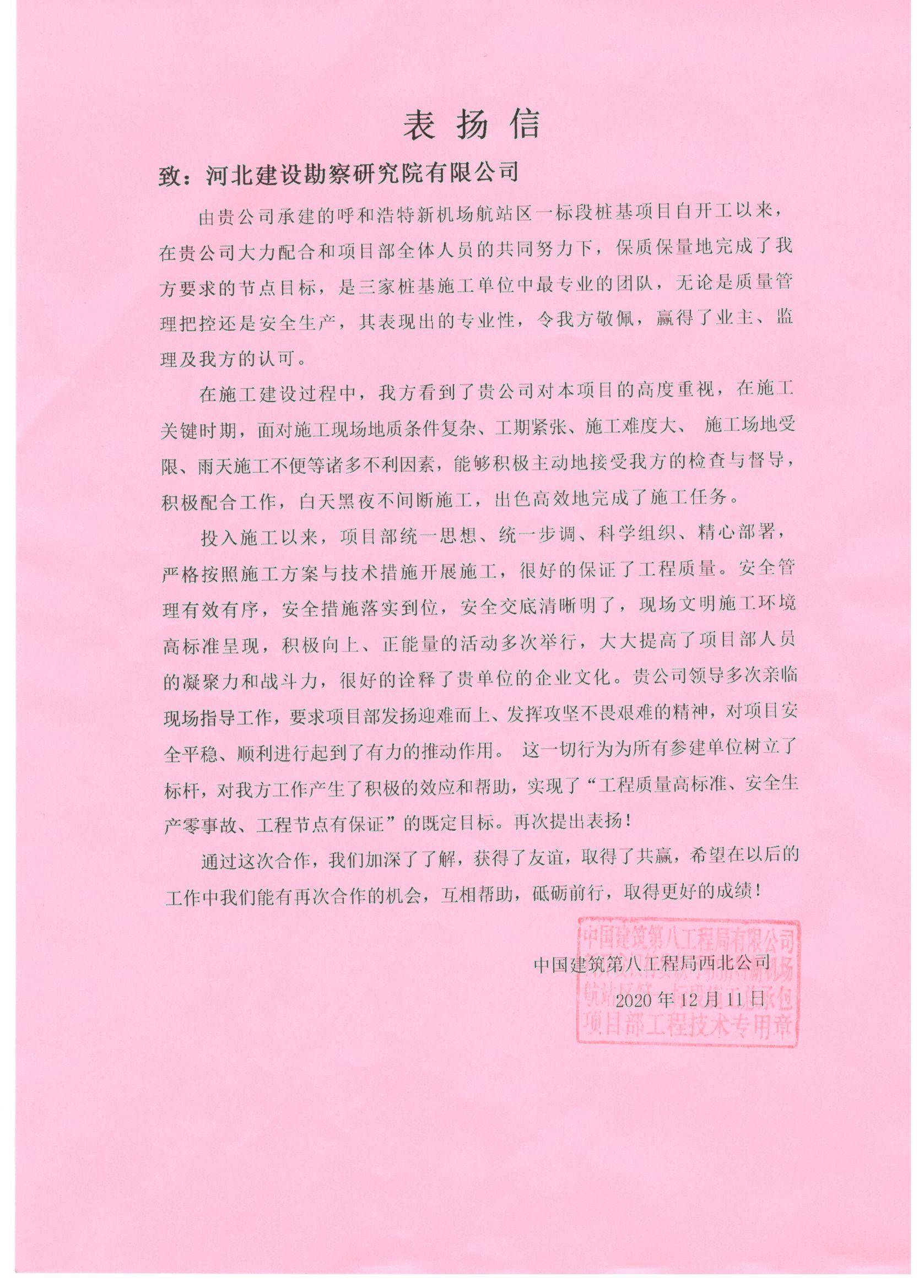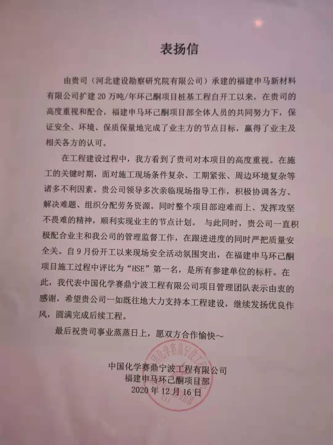 近日,公司收到中國(guó)化學(xué)賽鼎寧波工程有限公司福建申馬環(huán)己酮項(xiàng)目部、中國(guó)建筑第八工程局西北公司呼和浩特新機(jī)場(chǎng)航站區(qū)一標(biāo)段樁基項(xiàng)目部的表?yè)P(yáng)信。