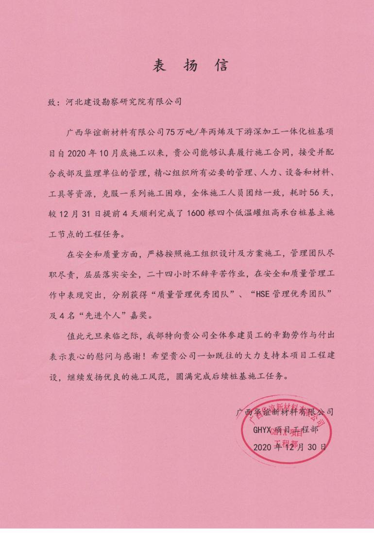 廣西華誼新材料有限公司75萬噸/年丙烯及下游深加工一體化樁基項(xiàng)目部,近日收到來自甲方的表揚(yáng)信及嘉獎。