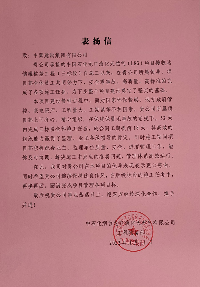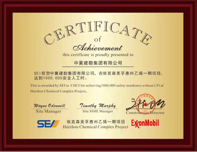 廣東惠州??松梨诨葜菀蚁┮黄陧?xiàng)目樁基工程,榮獲??松梨冢ɑ葜荩┗び邢薰炯爸袊?guó)石化工程建設(shè)有限公司惠州項(xiàng)目部“達(dá)到1000000安全人工時(shí)”優(yōu)秀團(tuán)隊(duì)獎(jiǎng),耿蕩榮獲“安全先進(jìn)個(gè)人獎(jiǎng)”。