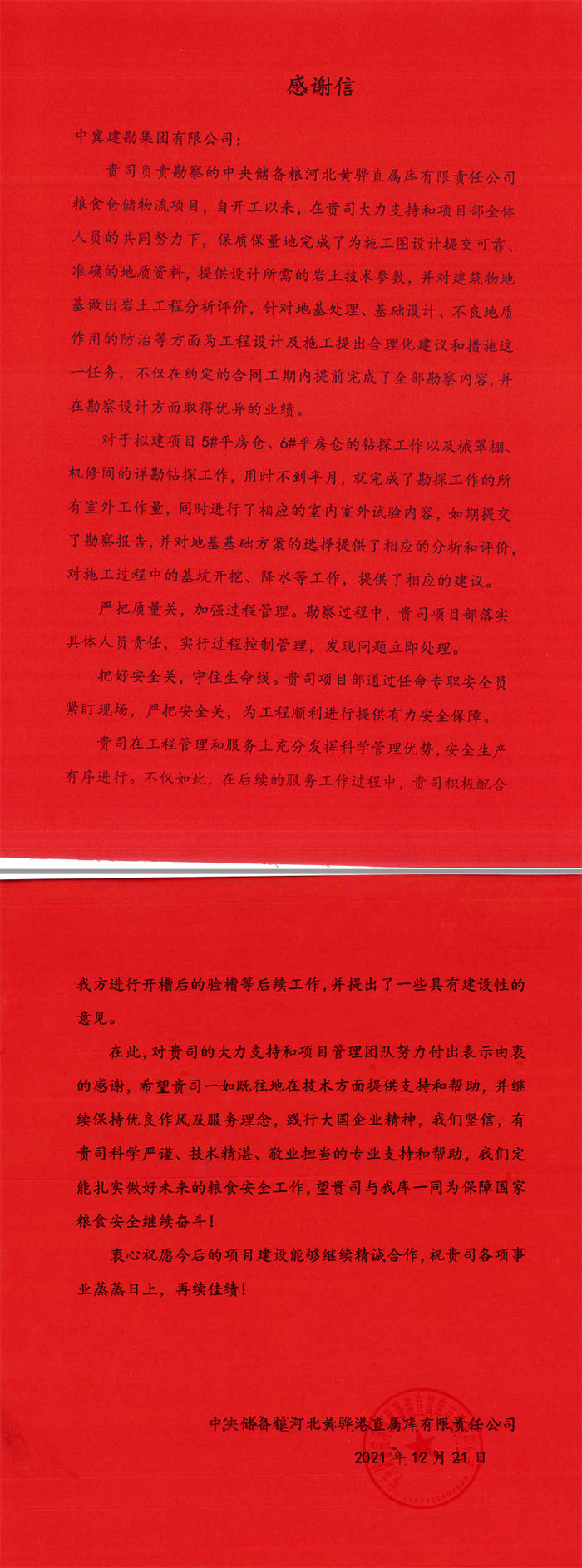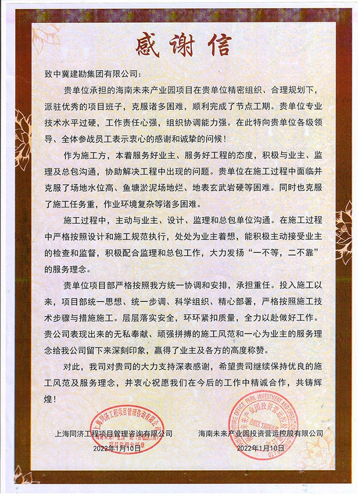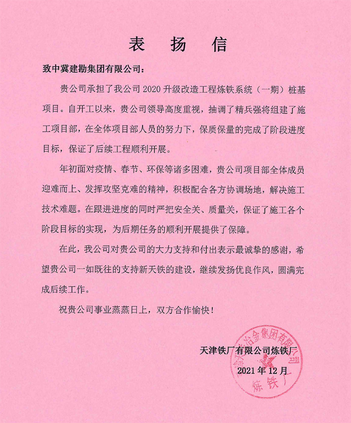天津鐵廠有限公司煉鐵廠對(duì)我公司在疫情期間為確保項(xiàng)目目標(biāo)迎難而上、攻堅(jiān)克難的精神表示贊賞,對(duì)我公司一如既往的支持和客戶至上的理念表示感謝。中儲(chǔ)糧河北黃驊直屬庫有限公司對(duì)我公司的勘察報(bào)告、后續(xù)驗(yàn)收服務(wù)表示贊許,對(duì)公司提供的科學(xué)嚴(yán)謹(jǐn)、技術(shù)精湛、敬業(yè)擔(dān)當(dāng)?shù)膶I(yè)支持和幫助表示感謝。