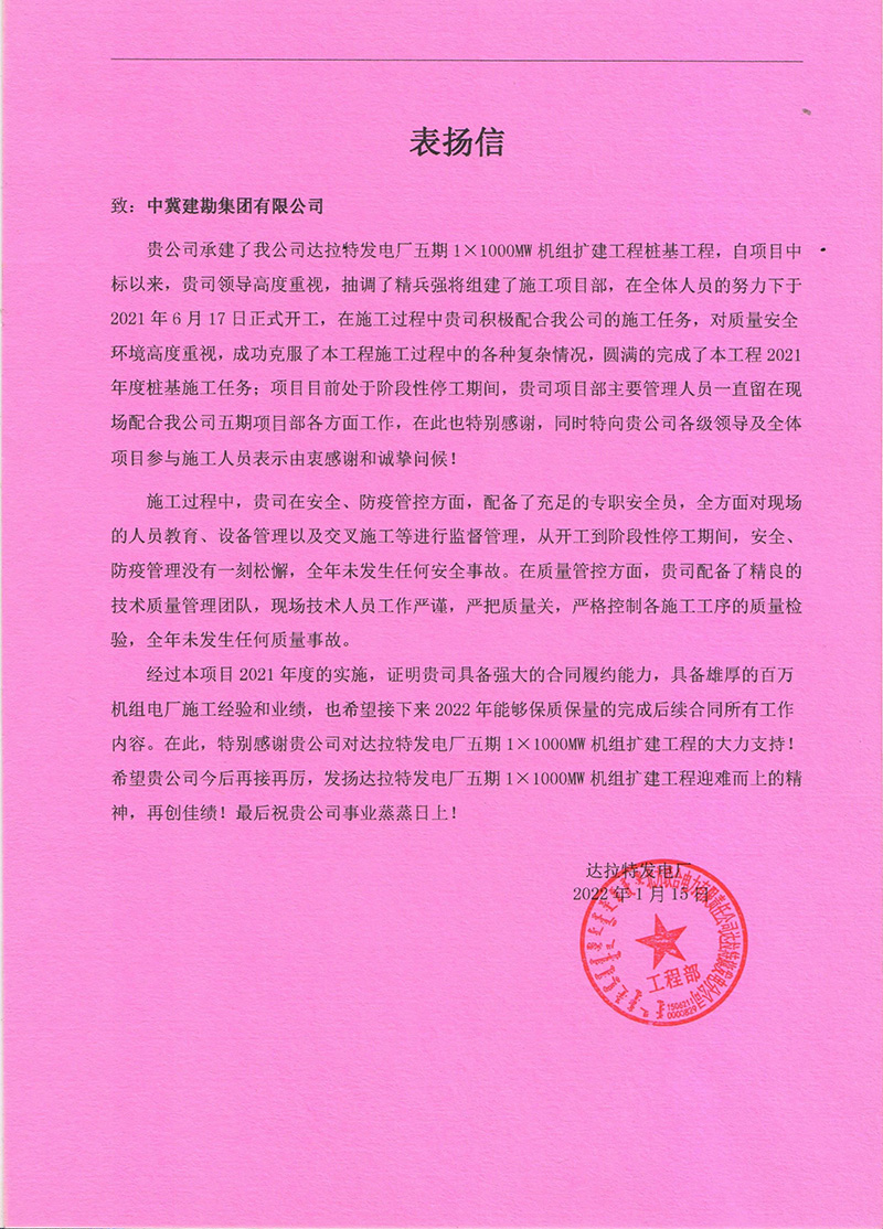 近日,由我公司承建的達(dá)拉特發(fā)電廠五期1×1000MW機(jī)組擴(kuò)建項(xiàng)目樁基工程,收到達(dá)拉特發(fā)電廠工程指揮部發(fā)來的表揚(yáng)信,對(duì)我司承接的樁基施工質(zhì)量、安全文明施工、進(jìn)度管控及各方面的配合表示認(rèn)可。