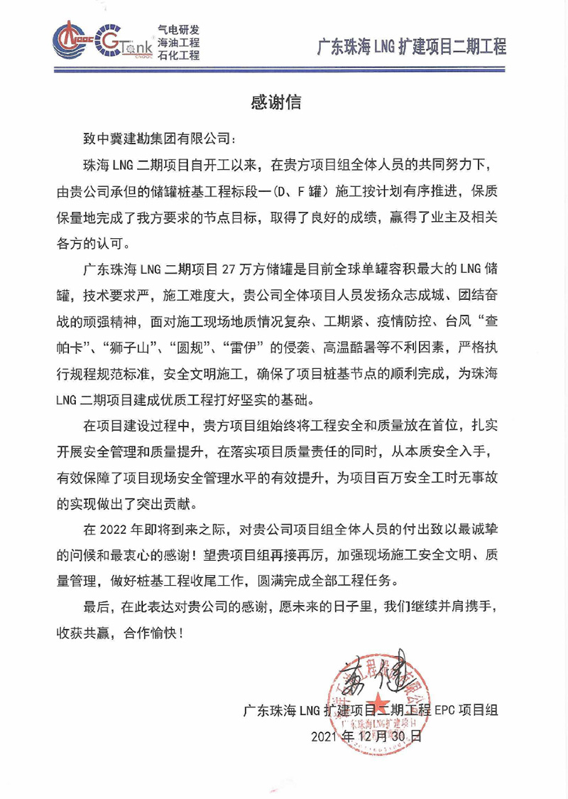廣東珠海LNG二期項(xiàng)目27萬方儲(chǔ)罐是目前全球單罐容積最大的LNG儲(chǔ)罐,技術(shù)要求嚴(yán),施工難度大。在施工工過程中,全體項(xiàng)目人員發(fā)揚(yáng)眾志成城、團(tuán)結(jié)奮戰(zhàn)的頑強(qiáng)精神,面對(duì)施工現(xiàn)場地質(zhì)情況復(fù)雜、工期緊、疫情防控、臺(tái)風(fēng)“查帕卡”、“獅子山”、“圓規(guī)”、“雷伊”的侵襲、高溫酷暑等不利因素,迎難而上,頑強(qiáng)奮戰(zhàn),保質(zhì)、安全、高效地履行合同任務(wù),確保了項(xiàng)目樁基節(jié)點(diǎn)的順利完成,為珠海LNG二期項(xiàng)目建成優(yōu)質(zhì)工程打好堅(jiān)實(shí)基礎(chǔ),為項(xiàng)目百萬安全工時(shí)無事故的實(shí)現(xiàn)做出了突出貢獻(xiàn),受到業(yè)主及總包方的高度贊揚(yáng)。