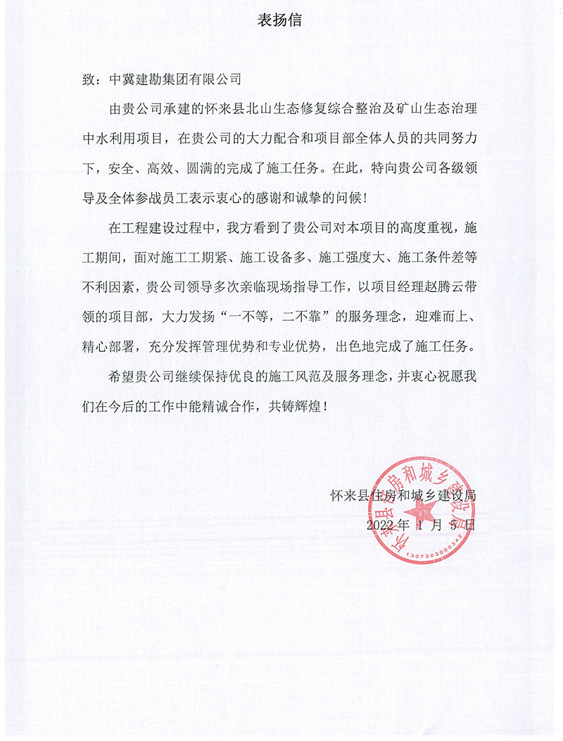 懷來縣北山生態(tài)修復綜合整治及礦山生態(tài)治理中水利用項目克服施工工期緊、施工設備多、施工強度大、施工條件差等不利因素,大力發(fā)揚“一不等,二不靠”作風,迎難而上、精心部署,出色的完成了施工任務,受到甲方領導的一致好評。