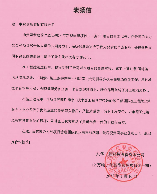 12萬噸/年炭黑項目(一期)項目強夯施工圓滿完成施工任務,總包方對我公司年青的項目團隊高度認可,稱他們是所有參建單位的標桿,充分展示了我公司年青一代的干勁與活力。
