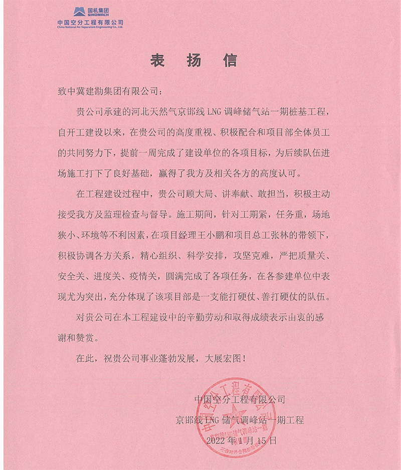 京邯線LNG儲氣調(diào)峰站一期項目樁基工程精心組織、科學安排、攻堅克難,提前一周完工交付,為上部單位進場施工打下良好基礎,贏得了總包方及相關各方的高度認可。