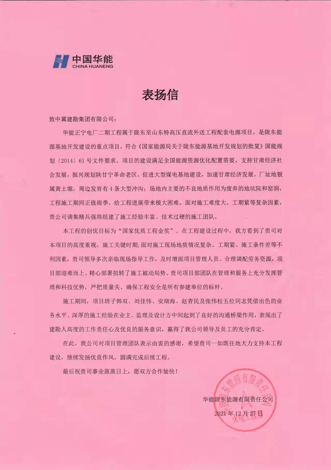華能正寧電廠二期樁基工程屬于隴東至山東特高壓直流外送工程配套電源項目,是隴東能源基地開發(fā)建設(shè)的重點項目, 在工程建設(shè)過程中面對施工現(xiàn)場地質(zhì)情況復(fù)雜、工期緊、施工條件差等不利因素,項目部迎難而上、精心部署扭轉(zhuǎn)了施工被動局勢。在管理和服務(wù)上充分發(fā)揮管理和科技優(yōu)勢,嚴把質(zhì)量關(guān)、確保工程安全是所有參建單位的標桿。其中項目部班子韓雙、劉佳偉、趙青民、安瑞海及張偉松五位同志憑借出色的業(yè)務(wù)水平、深厚的施工經(jīng)驗在業(yè)主、監(jiān)理及設(shè)計方中間起到了良好的溝通橋梁作用,表現(xiàn)出了建勘人高度的工作責(zé)任心及優(yōu)良的服務(wù)意識,收到業(yè)主及監(jiān)理的高度贊揚。