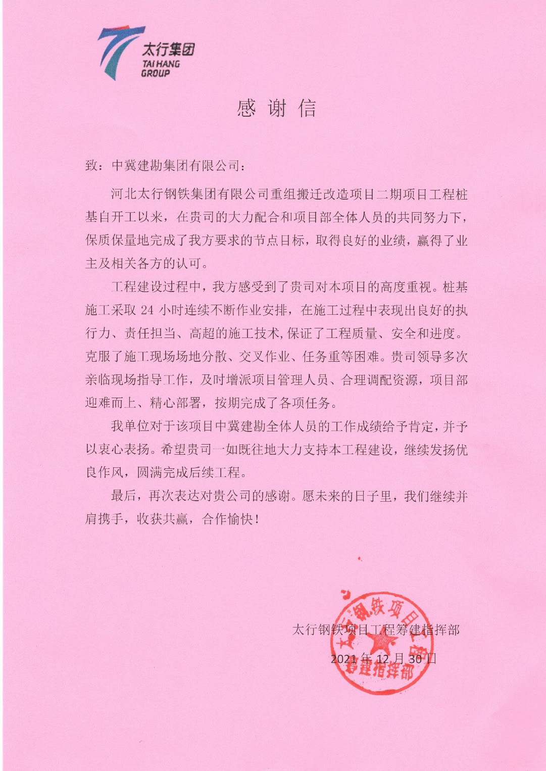 河北太行鋼鐵集團有限公司重組搬遷改造項目二期項目樁基工程位于河北武安工業(yè)園區(qū)南洺河工業(yè)園。本項目包括焦電聯(lián)產(chǎn)、二期發(fā)電、洗煤廠及二期1座高爐等附屬設(shè)施。施工期間迫于業(yè)主工期要求,不斷增加區(qū)域和設(shè)備,同時涉及多處交叉施工,給施工開展及管理帶來了一定難度。通過公司的大力支持、項目部的統(tǒng)籌安排以及全體人員的辛苦付出。面對規(guī)模較大、場地分散、交叉施工等多項不利因素,項目全體人員盡職盡責(zé),確保項目順利開展,整個施工期間未發(fā)生安全質(zhì)量事故,各項指標均滿足合同要求,充分發(fā)揮建勘精神。得到了業(yè)主的認可和贊揚,并收到業(yè)主發(fā)來的表揚信,為以后更多的合作奠定基礎(chǔ)。