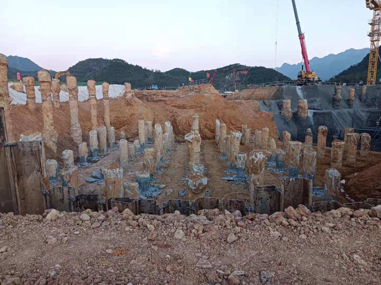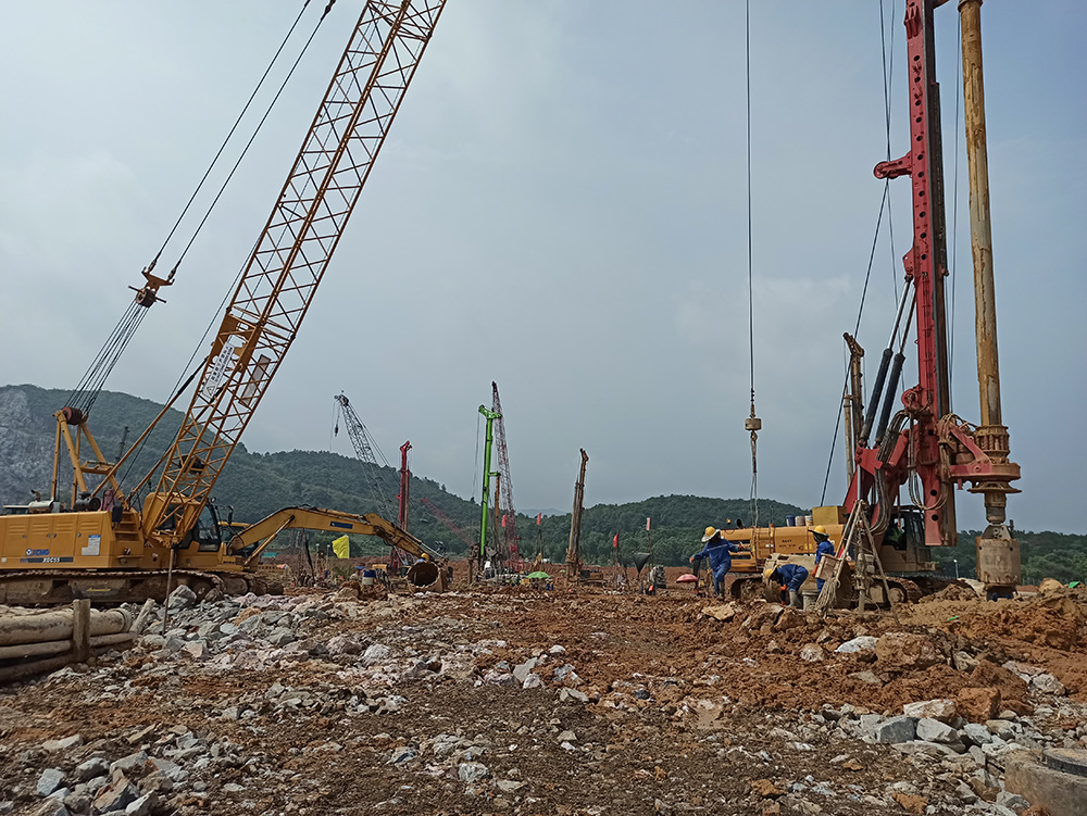 本工程于2021年04月10日開工,2022年01月27日現(xiàn)場樁基施工完工,工程施工期間累計(jì)投入施工人員200余人和大功率旋挖鉆機(jī)10臺(tái)以及相關(guān)匹配的機(jī)械設(shè)備??朔擞昙?、高溫和地質(zhì)條件復(fù)雜等諸多不利因素,累計(jì)完成鉆孔灌注樁1857根,處理溶洞約31000m³(含回填片石、水泥、C20砼及注漿和遇溶洞樁超灌混土量)。