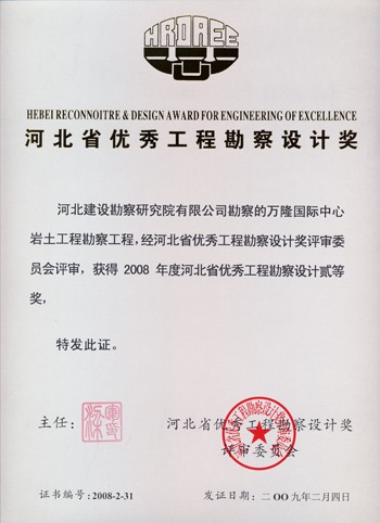 萬隆國(guó)際中心巖土工程勘察獲河北省優(yōu)秀工程勘察設(shè)計(jì)二等獎(jiǎng)。