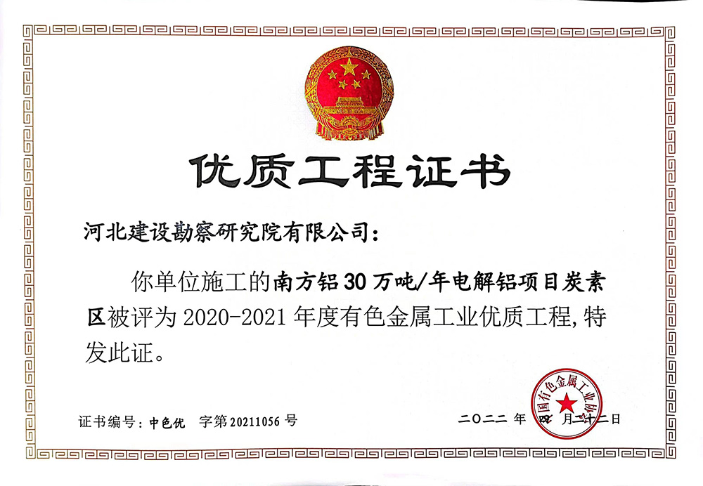 由我單位施工的南方鋁30萬(wàn)噸/年電解鋁項(xiàng)目碳素區(qū)被評(píng)為2020—2021年度有色金屬工業(yè)優(yōu)質(zhì)工程獎(jiǎng)。