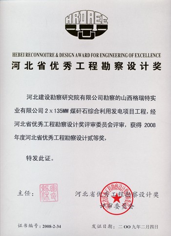 山西格瑞特實(shí)業(yè)有限公司2×135MW煤矸石綜合利用發(fā)電項(xiàng)目獲河北省優(yōu)秀工程勘察設(shè)計(jì)二等獎。