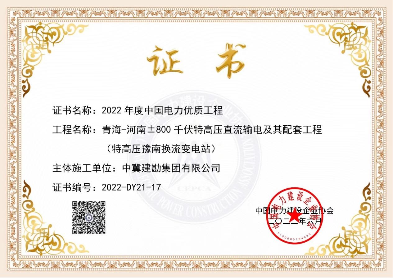 豫南換流站項(xiàng)目榮獲2022年度中國電力行業(yè)優(yōu)質(zhì)工程獎(jiǎng)
