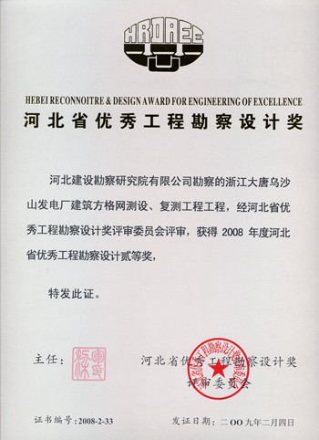 我公司承擔的浙江大唐烏沙山電廠建筑方格網測設、復測工程獲河北省優(yōu)秀工程勘察設計二等獎。