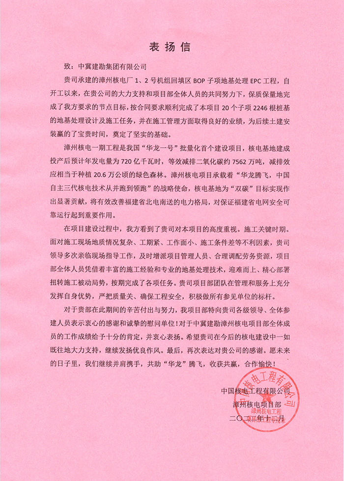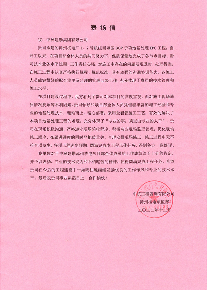 漳州核電一期工程是我國“華龍一號(hào)”批量化首個(gè)建設(shè)項(xiàng)目,承載著“華龍騰飛,中國自主三代核電技術(shù)從并跑到領(lǐng)跑”的戰(zhàn)略使命,核電基地為“雙碳”目標(biāo)實(shí)現(xiàn)作出顯著貢獻(xiàn),是國家核電建設(shè)的重點(diǎn)項(xiàng)目。在工程建設(shè)過程中面對(duì)規(guī)模較大、場地分散、交叉施工等多項(xiàng)不利因素,項(xiàng)目部迎難而上、精心部署、晝夜施工,確保安全、質(zhì)量的情況下按期完成了各項(xiàng)任務(wù)。項(xiàng)目部在谷習(xí)光同志的帶領(lǐng)下,在管理和服務(wù)上充分發(fā)揮自身優(yōu)勢(shì),積極爭當(dāng)所有參見單位的標(biāo)桿,得到了甲方和監(jiān)理的高度贊揚(yáng),為以后更多的合作奠定了堅(jiān)實(shí)基礎(chǔ)。