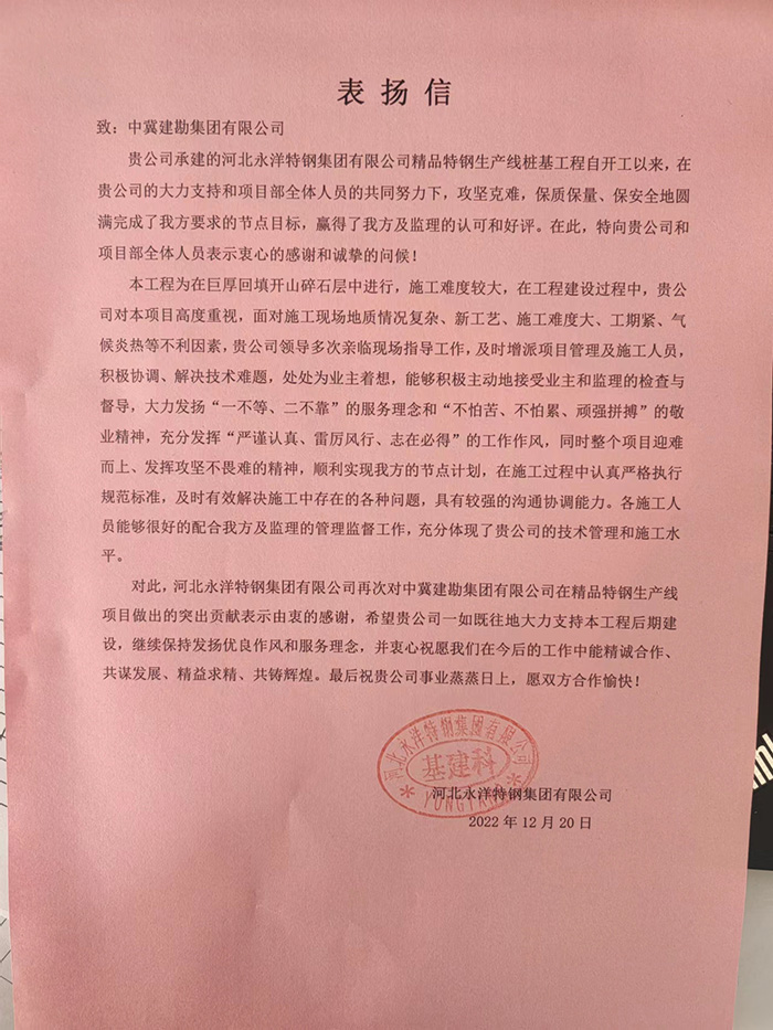河北永洋特鋼集團(tuán)有限公司精品特鋼生產(chǎn)線樁基工程自開工以來,在項(xiàng)目部全體人員的共同努力下,攻堅(jiān)克難,保質(zhì)保量保安全地圓滿完成了業(yè)主要求的節(jié)點(diǎn)目標(biāo),大力發(fā)揚(yáng)“一不等、二不靠”的服務(wù)理念和“不怕苦、不怕累、頑強(qiáng)拼搏”的敬業(yè)精神,贏得了業(yè)主及監(jiān)理的認(rèn)可和好評(píng)。
