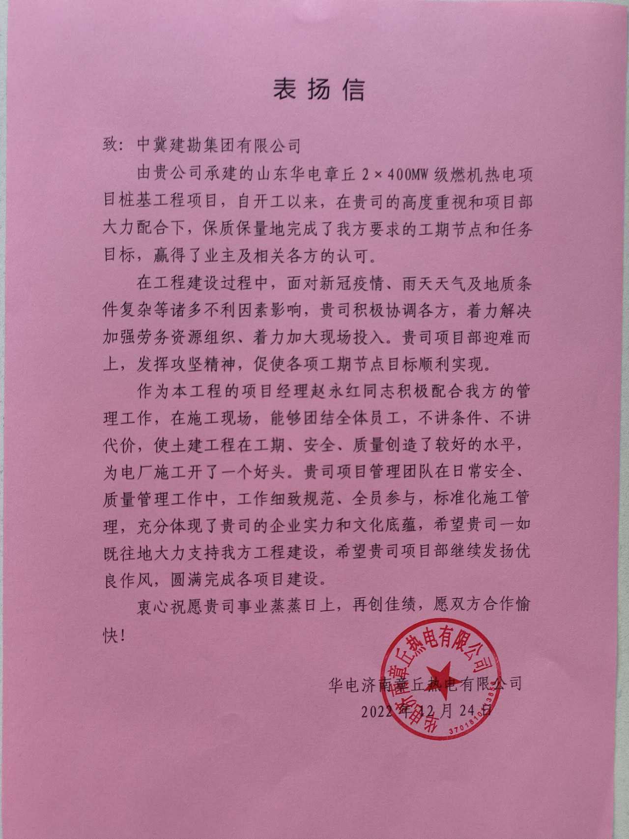 山東華電章丘2×400MW級(jí)燃機(jī)熱電項(xiàng)目樁基工程,在工程建設(shè)過程中,面對(duì)新冠疫情、雨天天氣及地質(zhì)條件復(fù)雜等諸多不利影響,在項(xiàng)目經(jīng)理趙永紅同志的帶領(lǐng)下,能夠團(tuán)結(jié)一致,不講條件,使土建工程在工期、安全、質(zhì)量創(chuàng)造了較好的水平,為電廠施工開了一個(gè)好頭。項(xiàng)目管理團(tuán)隊(duì)在日常安全、質(zhì)量管理工作中,工作細(xì)致規(guī)范、標(biāo)準(zhǔn)化施工管理,充分體現(xiàn)了我公司的企業(yè)實(shí)力和文化底蘊(yùn)。