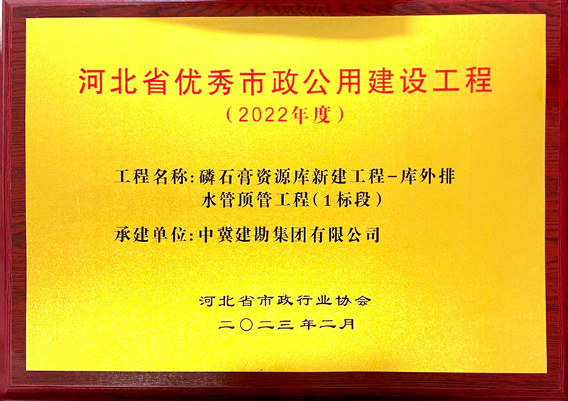 近日,河北省市政行業(yè)協(xié)會發(fā)布消息,經(jīng)過審核申報(bào)材料、查驗(yàn)施工現(xiàn)場、專家綜合評議,我公司市政工程項(xiàng)目“磷石膏資源庫新建工程——庫外水管頂管工程(1標(biāo)段)”被評為河北省優(yōu)秀市政公用建設(shè)工程,并為項(xiàng)目經(jīng)理高立康同志頒發(fā)了榮譽(yù)證書。