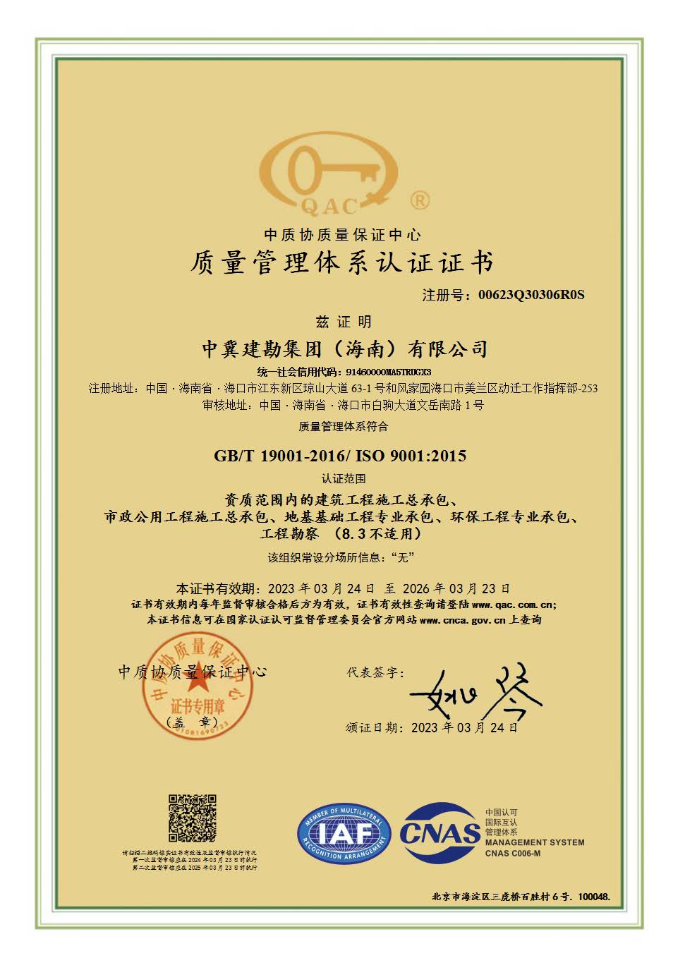 2023年3月13日至18日,經(jīng)認證機構現(xiàn)場審核,中冀建勘集團(海南)有限公司順利通過了綜合管理體系的認證,并于3月24日取得了中質(zhì)協(xié)質(zhì)量保證中心頒發(fā)的綜合管理體系認證證書。