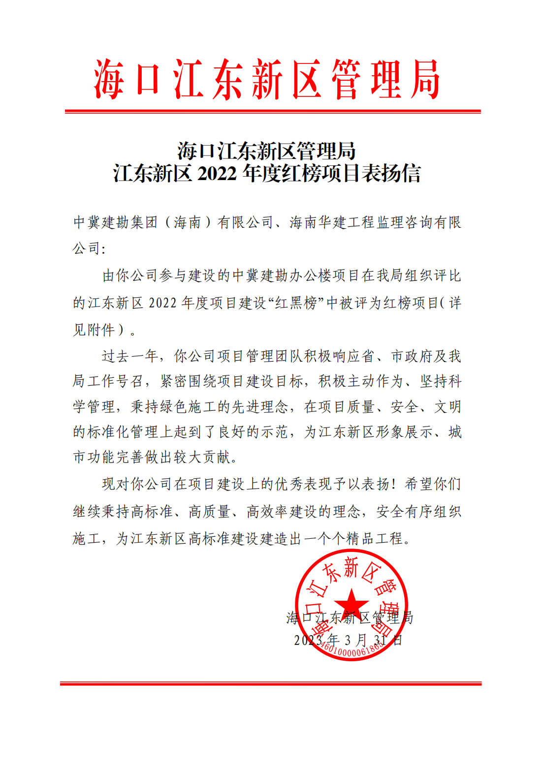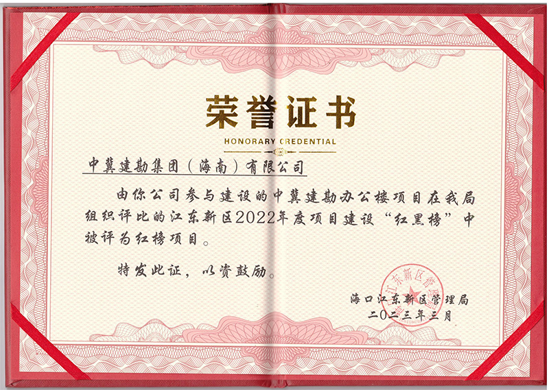 人勤春來早,實干正當(dāng)時。2023年3月31日,為促進(jìn)項目建設(shè)進(jìn)度,營造“安全、文明、有序”的建設(shè)氛圍,??诮瓥|新區(qū)管理局公布了2022年度項目建設(shè)“紅黑榜”,“中冀建勘辦公樓”項目再次受到表彰,并為項目頒發(fā)了榮譽(yù)證書。