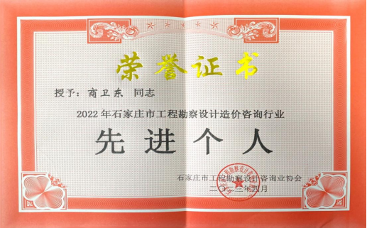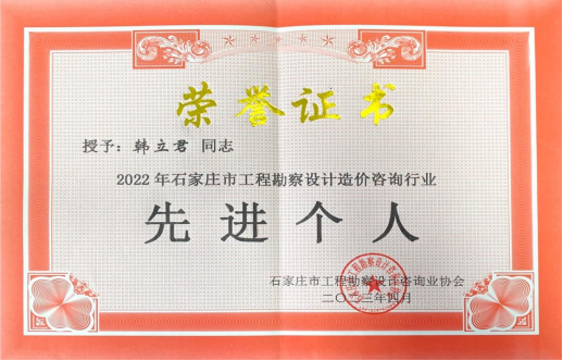 近日,石家莊市工程勘察設(shè)計咨詢業(yè)協(xié)會下發(fā)《關(guān)于表彰2022年石家莊市工程勘察設(shè)計造價咨詢行業(yè)先進(jìn)單位和先進(jìn)個人的通知》(石設(shè)協(xié)字【2023】2號),我公司被授予“2022年石家莊市工程勘察設(shè)計造價咨詢行業(yè)先進(jìn)單位”稱號,韓立君同志、商衛(wèi)東同志被授予“2022年石家莊市工程勘察設(shè)計造價咨詢行業(yè)先進(jìn)個人”稱號。