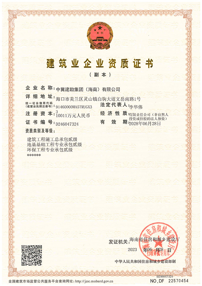 在集團公司領(lǐng)導(dǎo)的運籌帷幄下,2023年6月28日海南省住建廳通過了中冀建勘集團(海南)有限公司建筑業(yè)企業(yè)資質(zhì)升級申請,順利取得建筑工程施工總承包貳級、地基基礎(chǔ)工程專業(yè)承包貳級和環(huán)保工程專業(yè)承包貳級資質(zhì)。