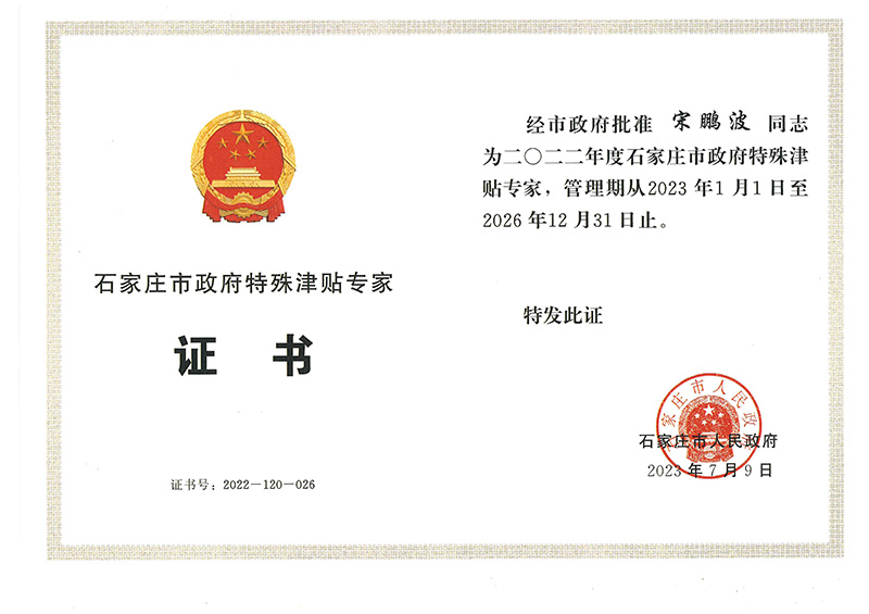 經(jīng)公司組織推薦,石家莊市人力資源和社會保障局組織評審,社會公示,石家莊市人民政府批準(zhǔn),我公司宋鵬波同志榮獲2022年度石家莊市政府特殊津貼專家。