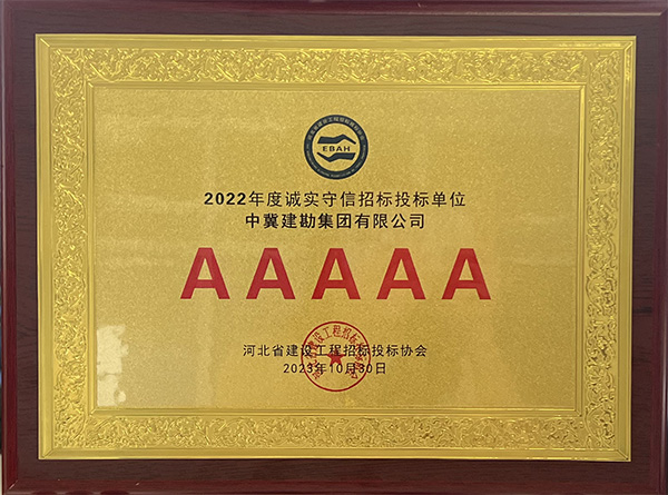 近日,我公司被河北省建設(shè)工程招標(biāo)投標(biāo)協(xié)會(huì)評(píng)為2022年度河北省建設(shè)工程招標(biāo)投標(biāo)誠(chéng)實(shí)守信5A級(jí)施工企業(yè)。