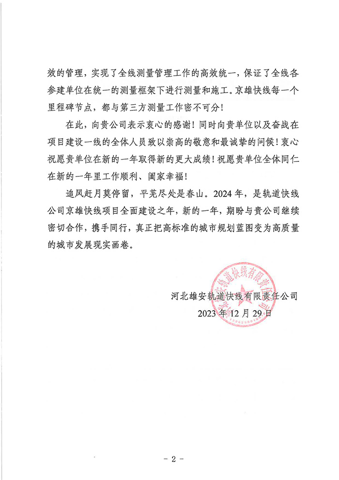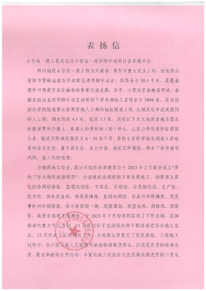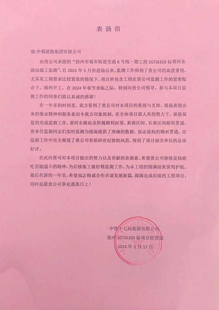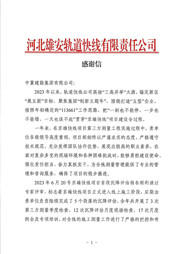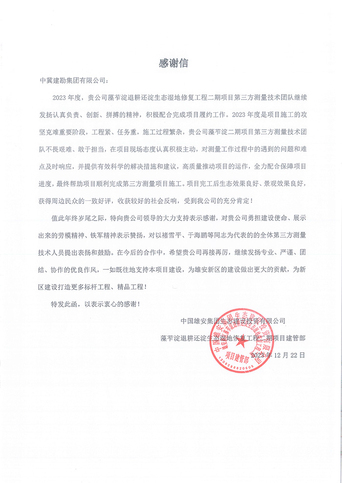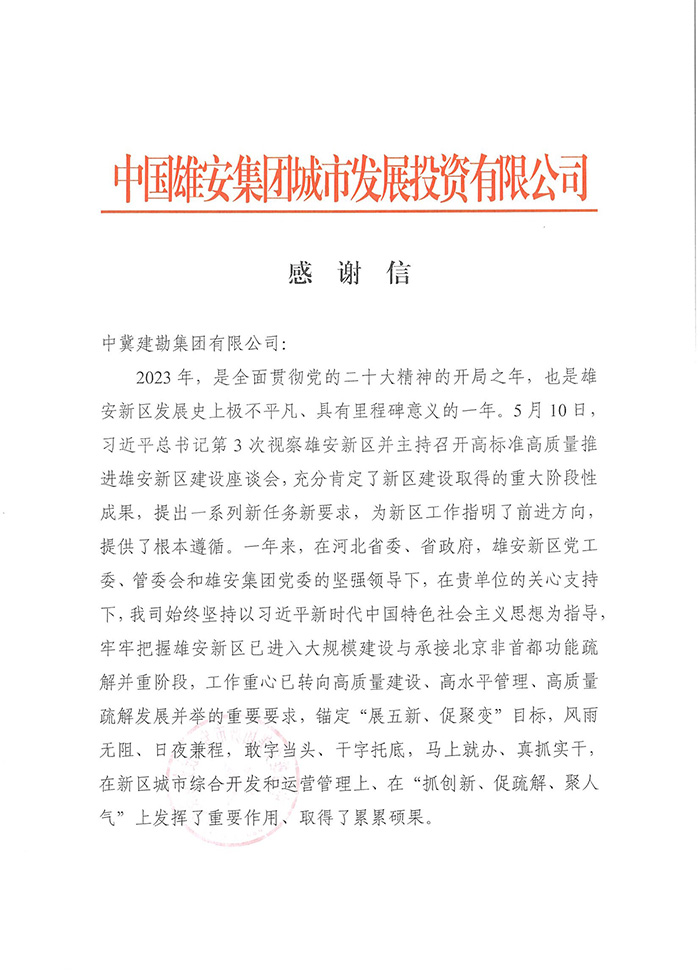 近期,公司陸續(xù)收到中國雄安集團(tuán)城市發(fā)展投資有限公司、河北雄安軌道快線有限責(zé)任公司、中國雄安集團(tuán)生態(tài)建設(shè)投資有限公司、中鐵五局、中鐵十七局、鄭州地鐵集團(tuán)、內(nèi)蒙古大唐國際克什克騰旗煤制天然氣電廠、大唐內(nèi)蒙古多倫電廠等業(yè)主單位發(fā)來的感謝信。我公司認(rèn)真負(fù)責(zé)、敢打能打硬仗的工作態(tài)度、頑強(qiáng)拼搏的施工風(fēng)范和一心為業(yè)主服務(wù)的理念,贏得了業(yè)主的高度認(rèn)可和贊揚(yáng),特發(fā)來感謝信深表感謝!