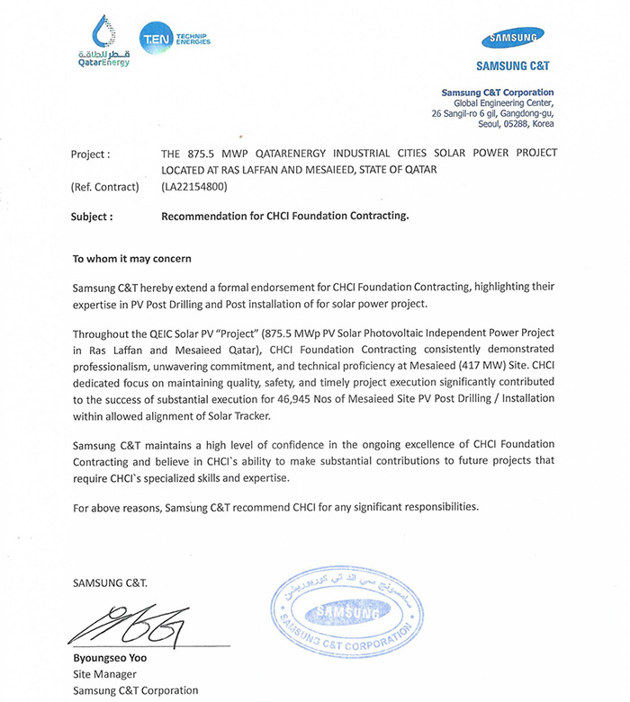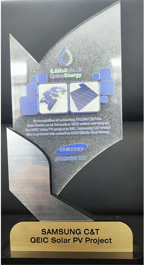 我公司收到卡塔爾能源875.5MW光伏發(fā)電項(xiàng)目業(yè)主方卡塔爾能源和總包方三星C&T公司聯(lián)合頒發(fā)的獎(jiǎng)杯和推薦信。業(yè)主及總包方高度認(rèn)可我公司項(xiàng)目履約能力,贊揚(yáng)我司對(duì)該項(xiàng)目成功交付做出重大貢獻(xiàn),表示愿意與我司建立長(zhǎng)期合作關(guān)系。基于我司卓越的履約表現(xiàn),三星C&T公司授予我司推薦信。