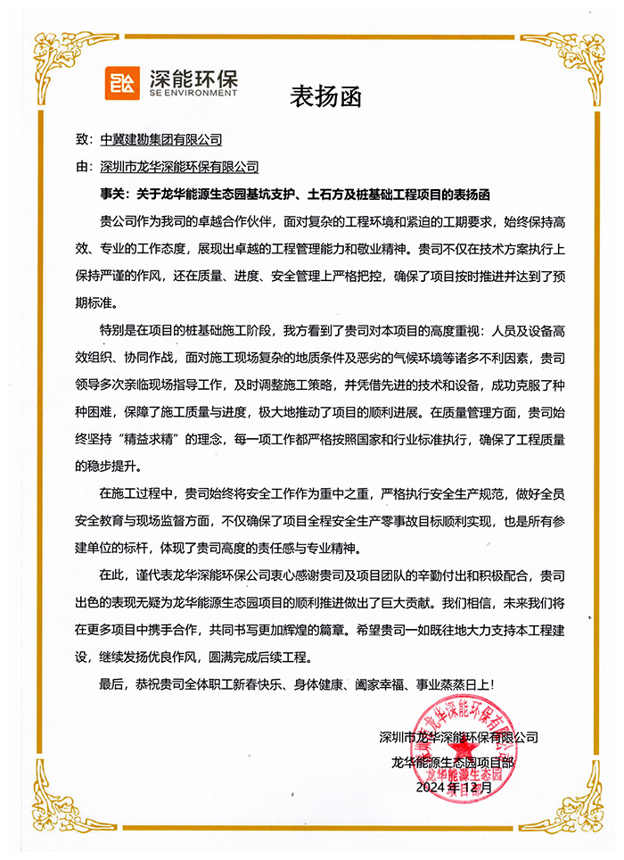 2024年12月20日,深圳市龍華深能環(huán)保有限公司發(fā)來表揚(yáng)信,對(duì)我公司正在施工的龍華能源生態(tài)源基坑支護(hù)、土石方及樁基礎(chǔ)工程項(xiàng)目在施工過程中,面對(duì)復(fù)雜的工程環(huán)境和緊迫的工期要求,始終保持高效、專業(yè)的工作態(tài)度,展現(xiàn)出卓越的工程管理能力和敬業(yè)精神,在技術(shù)方案執(zhí)行上嚴(yán)謹(jǐn)?shù)淖黠L(fēng),質(zhì)量、進(jìn)度、安全管理上嚴(yán)格的把控,以及我公司領(lǐng)導(dǎo)多次親臨現(xiàn)場指導(dǎo)工作,確保了項(xiàng)目按時(shí)推進(jìn)并達(dá)到了預(yù)期標(biāo)準(zhǔn),表示了衷心的感謝,并表達(dá)了未來將有更多的項(xiàng)目攜手合作。