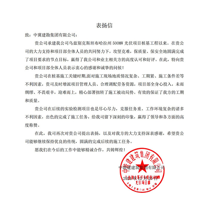 2024年12月20日,中能建建筑集團(tuán)有限公司發(fā)來表揚(yáng)信,對(duì)我公司施工的烏茲別克斯坦布哈拉州500MW光伏項(xiàng)目樁基工程及實(shí)驗(yàn)檢測項(xiàng)目施工過程中,未雨綢繆,攻堅(jiān)克難,合理調(diào)配人員和設(shè)備資源,克服了各種不利因素,保證了工程和質(zhì)量,出色的完成了施工任務(wù),贏得了領(lǐng)導(dǎo)和項(xiàng)目參建單位的高度稱贊,給予了表揚(yáng),并表示愿今后的工作中能夠繼續(xù)精誠合作。