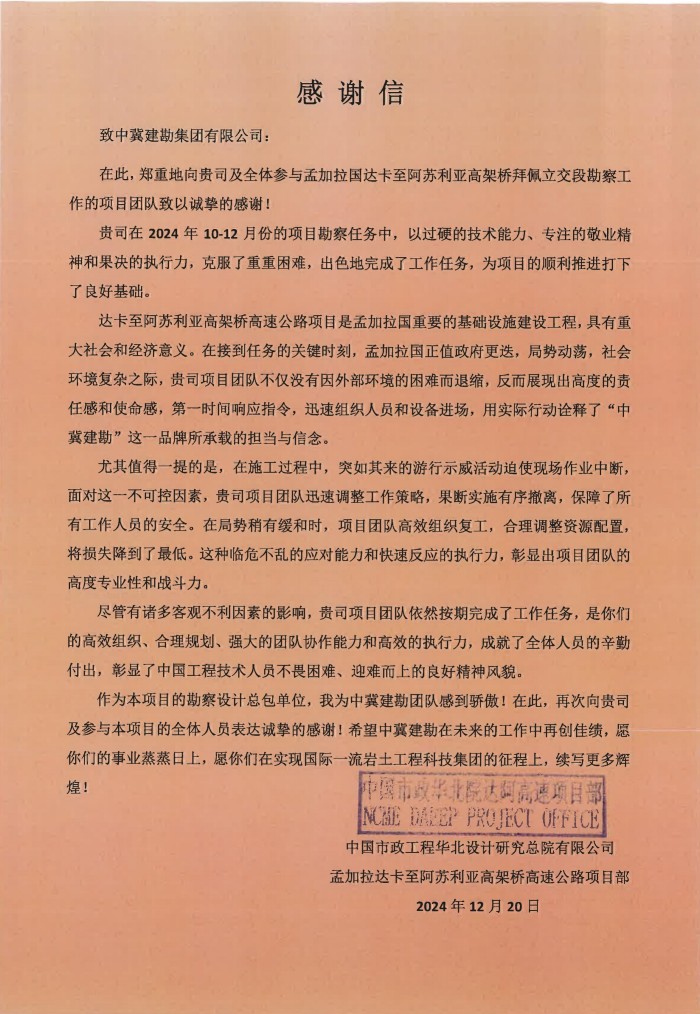 孟加拉達(dá)卡至阿蘇利亞高架橋高速公路項目部向我公司發(fā)來了感謝信,感謝我公司在項目勘察期間展現(xiàn)的高度專業(yè)精神和卓越執(zhí)行力。尤其在復(fù)雜的社會環(huán)境和突如其來的示威活動中,我公司項目團(tuán)隊臨危不亂,迅速調(diào)整工作策略,保障了項目的順利推進(jìn)和人員的安全。